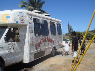 First stop: Giovanni's Shrimp Truck in Kahuku. Our family has always been partial to Romy's located a few trucks further down on Kamehameha Hwy, but since we also heard good stuff about Giovanni's, we decided to try something different this time. This shot is from the front/street facing side of the truck. Doesn't look like they're doing much business, eh?