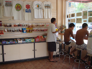 But the plus side to this location is that there is more room for seating. But our timing was a bit off as four boys took 'our' seats just as we walked in. "Awww man, poopy on those guys sitting in our seats," I thought. 10 minutes later I found out that it was my cousin sitting in that seat! He's the shirtless one on the right. Talk about small island!